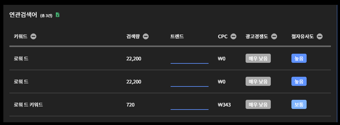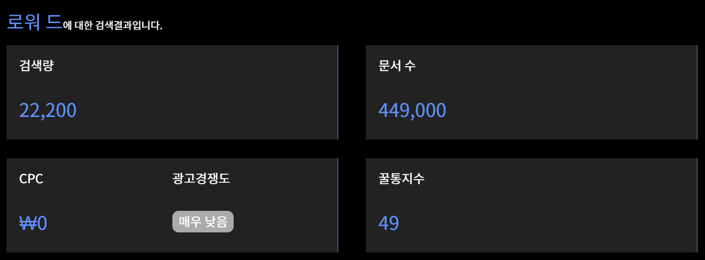 <로워드>를 검색해 보니 이런 화면이 떴다. 뭔가 굉장하다.>! 검색량은 얼마나 이걸 검색하나인것같고, 문서 수는 관련 문서 수 같고, CPC는 CPC인데... 0원인게 가능한지 잘 모르겠다. 그리고 꿀통지수?라는게 있는데, 높으면 좋은거고 낮으면 안좋은거겠지?