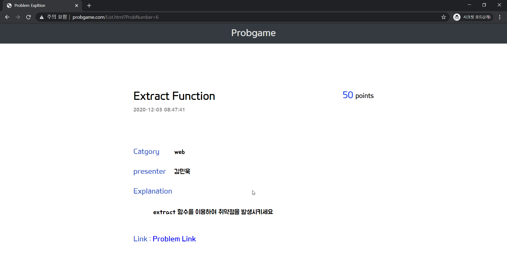extract 취약점을 이용하여 Probgame의 Extract Function 문제를 풀었다.
